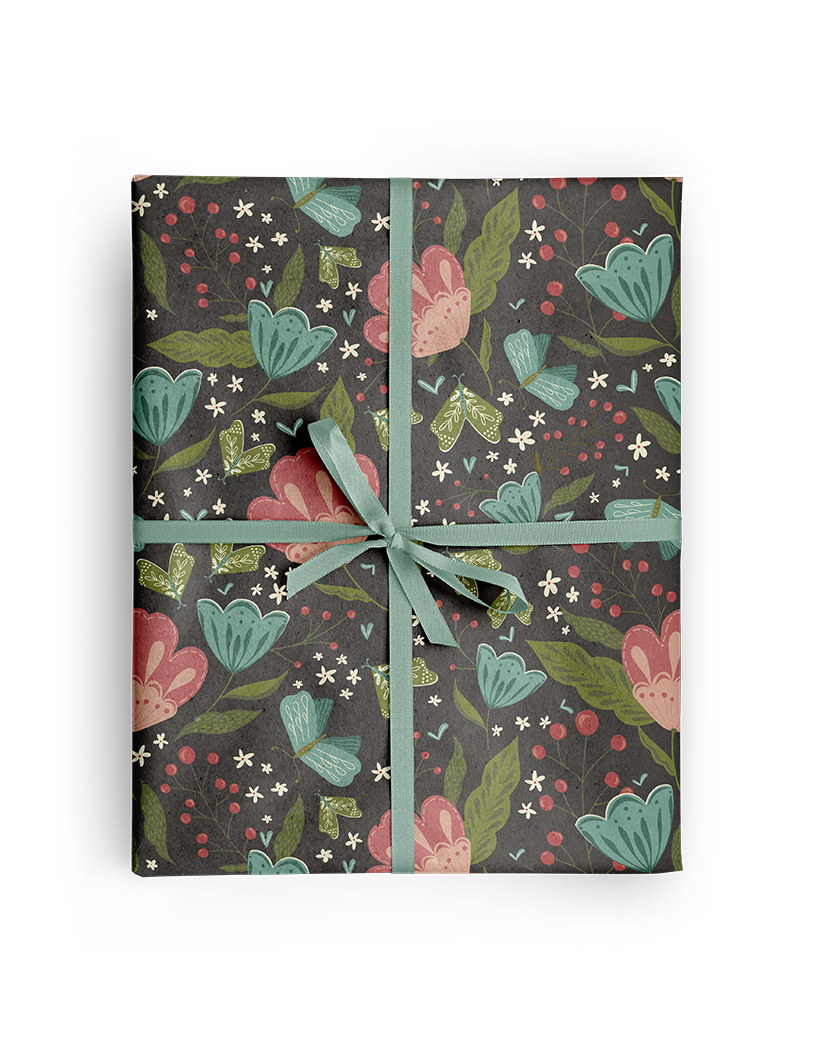 Discover the enchanting allure of our "May Flowers" wrapping paper, a must-have for boutique shop owners looking to captivate customers with unique, artisanal gift-wrapping options. This exquisite paper features a lush, dark gray canvas blooming with vibrant florals in blues, pinks, and greens, intricately interwoven with delicate moths and butterflies. Each roll includes two sheets measuring 20"x29", crafted from premium 70# paper, ensuring both durability and elegance. Perfect for any occasion, from spring celebrations to special gifts, this wrapping paper promises to add a touch of sophistication and a burst of color to your store's gift-wrapping collection. Elevate your retail offerings with "May Flowers" and watch as customers fall in love with its bohemian charm and intricate design, making every gift a work of art.