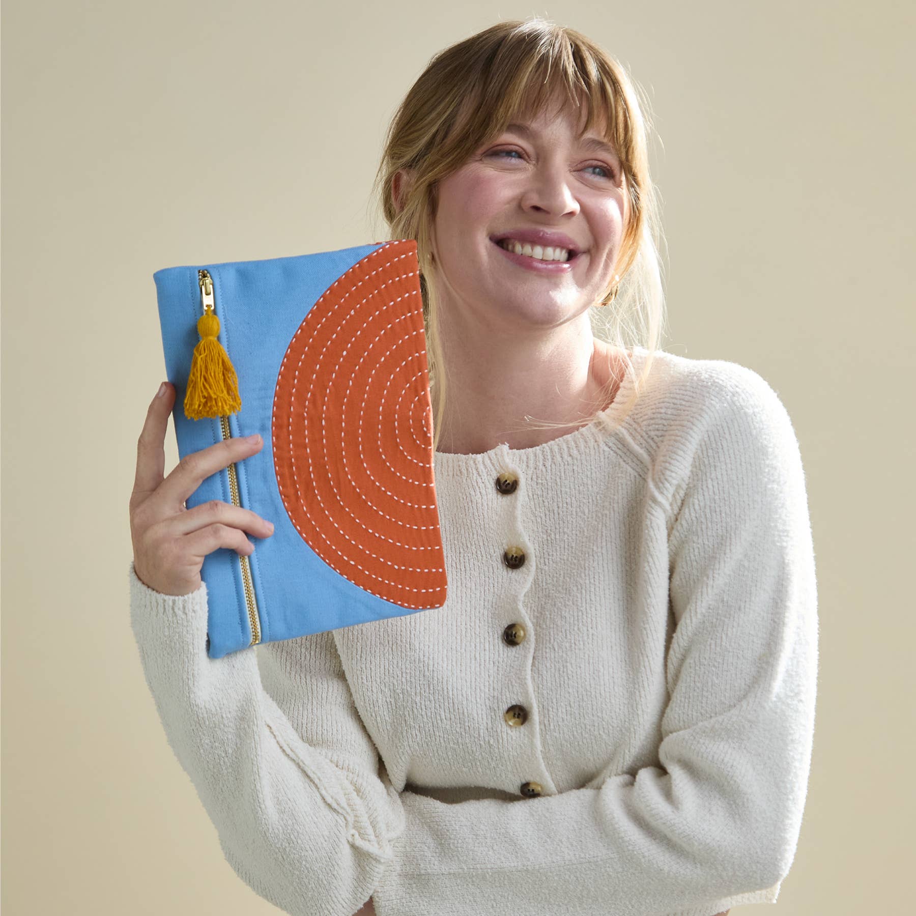 Designed with functionality in mind, it features a durable canvas lining that adds structure and protects your belongings, while a tassel-accented zipper adds a playful, bohemian touch. Whether you're organizing loose items in a larger bag or carrying it solo as a sleek clutch, the Eclipse Pouch adapts to your lifestyle with ease.