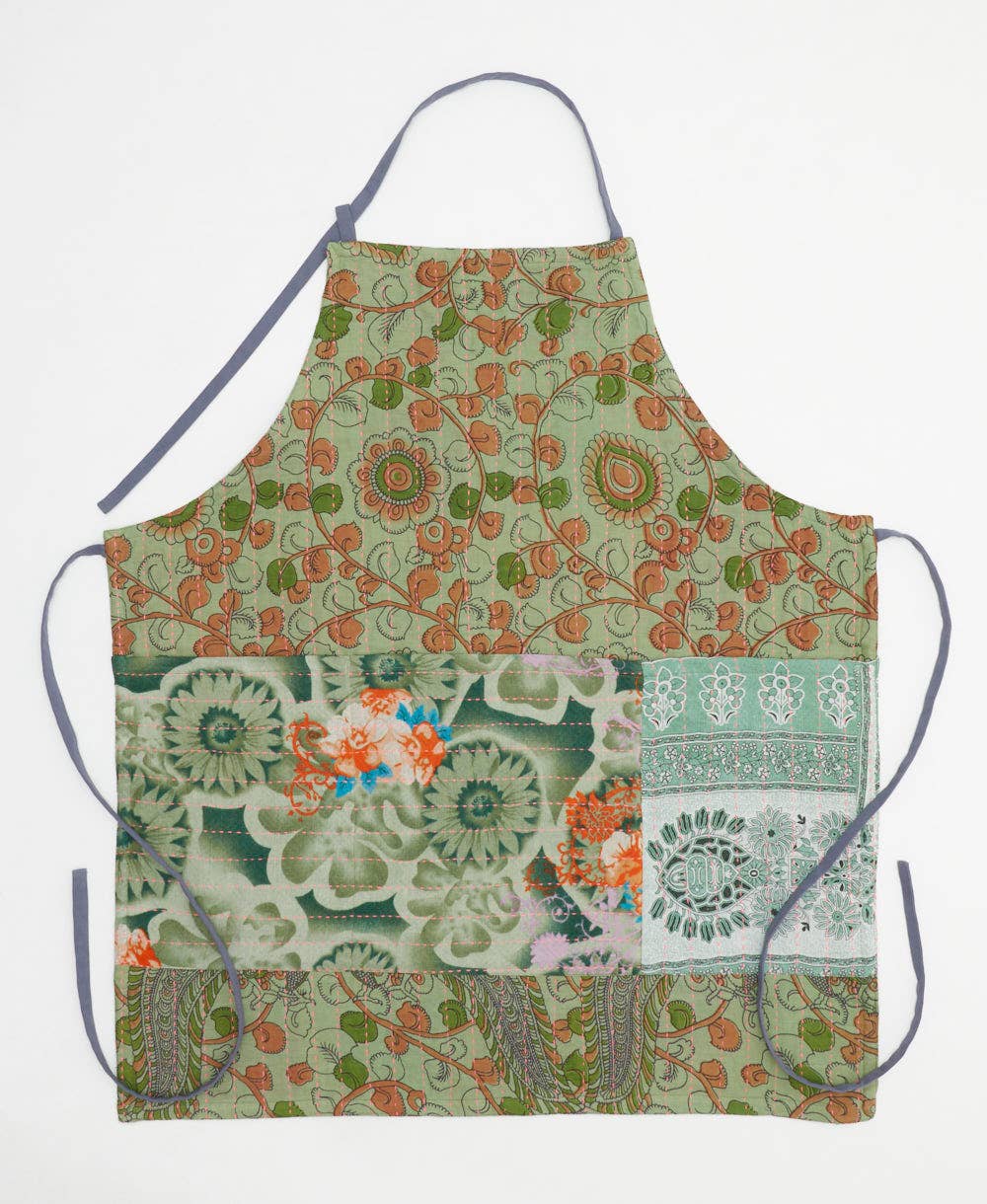 Elevate your creative endeavors with our lightweight Kantha Bib Apron. Each adjustable apron is a one-of-a-kind piece, showcasing the unique, handcrafted Kantha stitching that tells its own story. Designed with practicality in mind, it features three large front patch pockets to conveniently hold paintbrushes, kitchen utensils, gardening tools, or any other essentials you need while creating. The long, adjustable waist ties and neck tie ensure a comfortable and secure fit for any body type, making it versatile and functional. Whether you’re an artist in the studio, a chef in the kitchen, or a gardener tending to your plants, this kantha bib apron makes for the perfect companion.