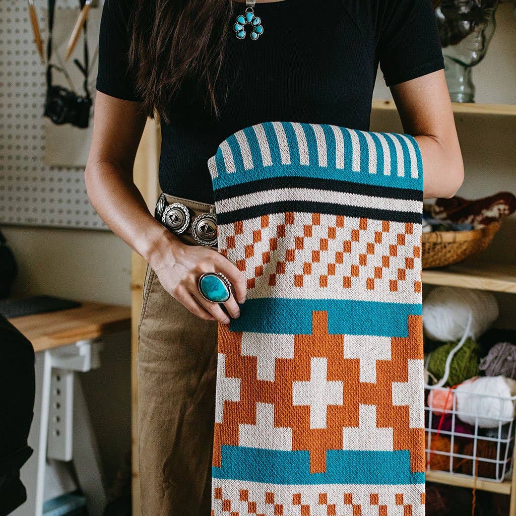 Native knitwear designer, Jennifer Berg, specifically designed this to honor the life of a desert dweller, whether it’s outside feeding the cows early in the morning on her grandma’s ranch or inside with her feet resting on a Navajo rug. The Desert Dweller Throw has rich tones that are traditionally found throughout the southwest landscapes with patterns that celebrate the resilience of the land and culture.