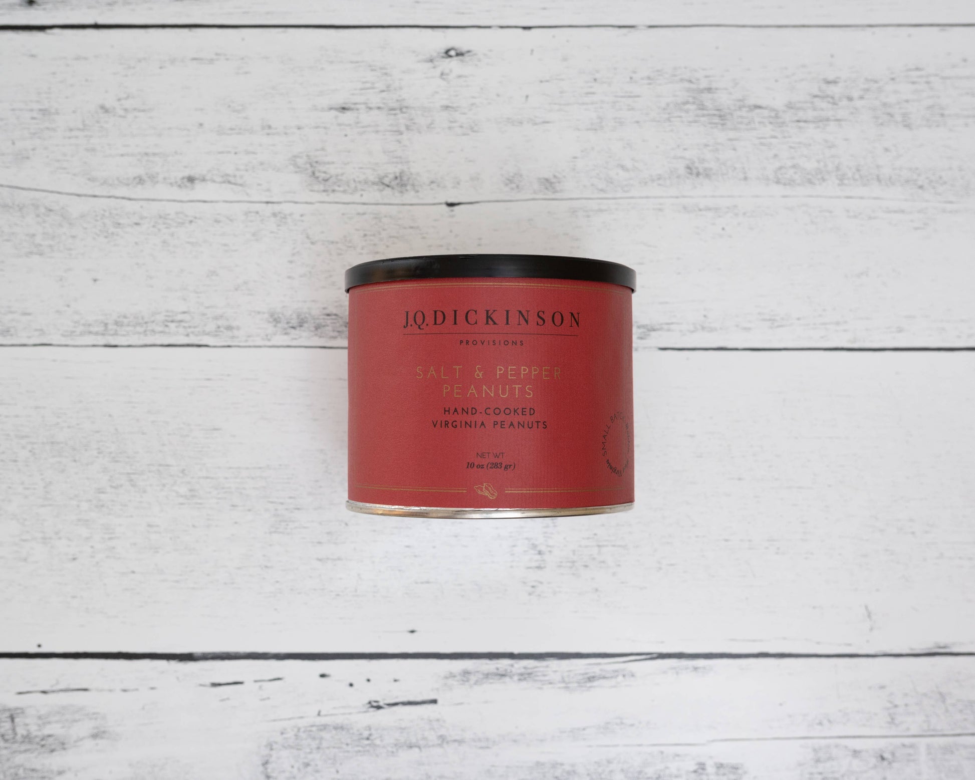 These Virginia peanuts are grown and roasted by Belmont Peanuts. J.Q. Dickinson sends salt to be added when they are roasted. They are crunchy and delicious. They make a great snack and a great gift! Three flavors: Plain salted, salt and pepper, and toffee crunch. 10 oz resealable cans