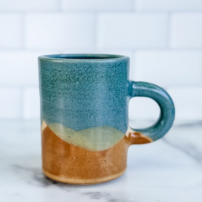 Where desert mesas meet coastal forests—this hand-thrown stoneware mug blends earthy brown with vibrant blue-green glaze, echoing sunbaked canyons and cool ocean air. A Southwest twist on a Pacific Northwest classic. Holds approximately 12–14 oz and features a comfortable, rounded handle. Handmade in Portland, Oregon.