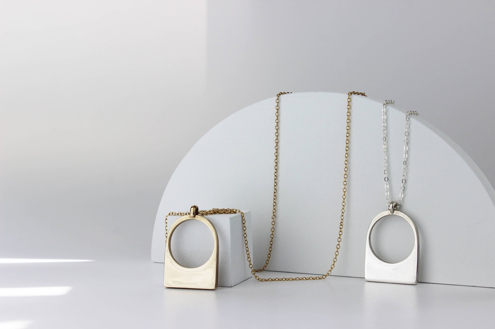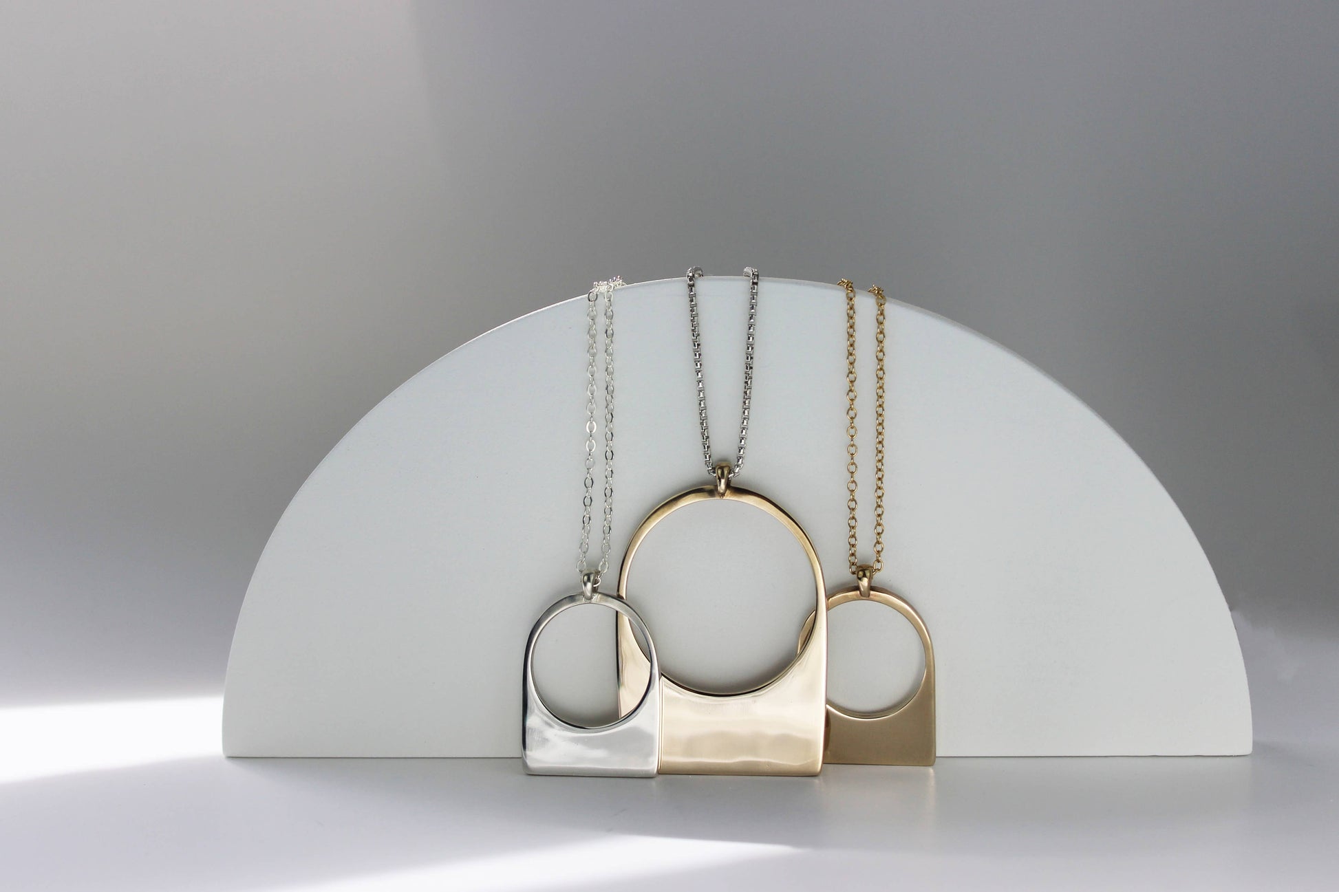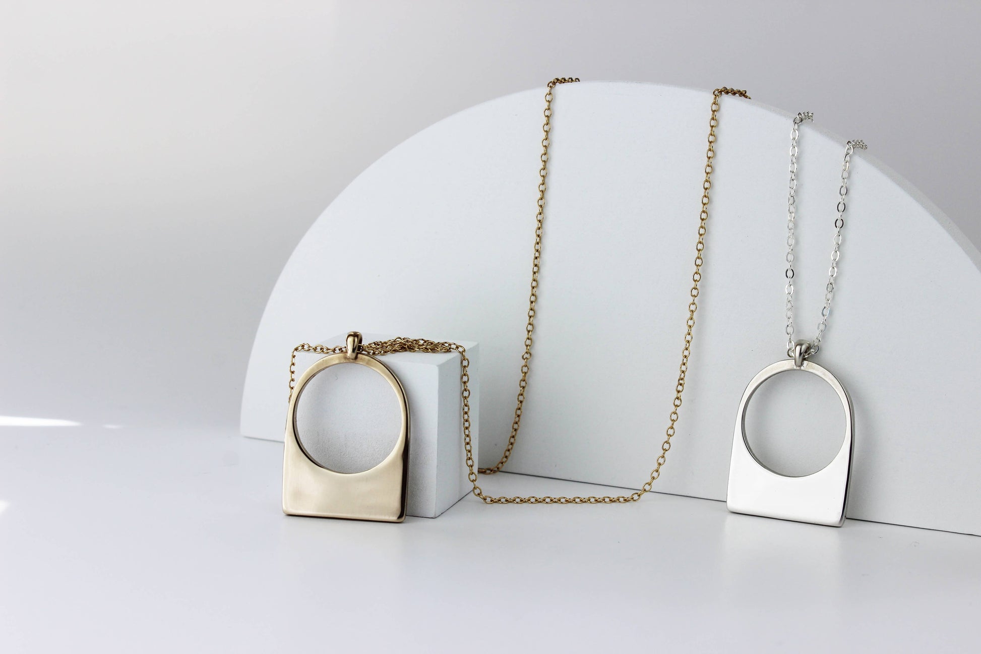 Architectural statement pendant, sculpted and carved in wax by hand and cast via lost wax casting.