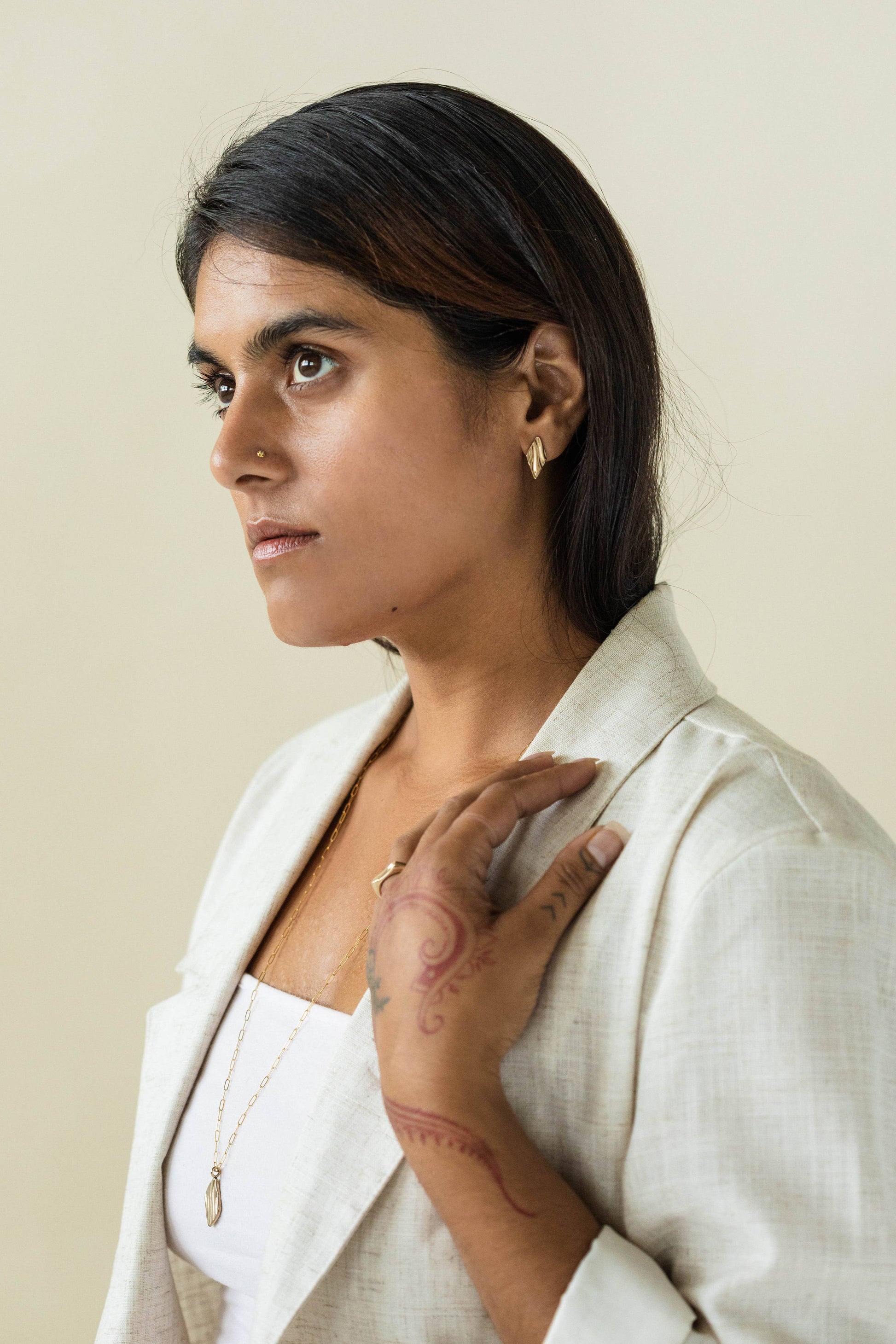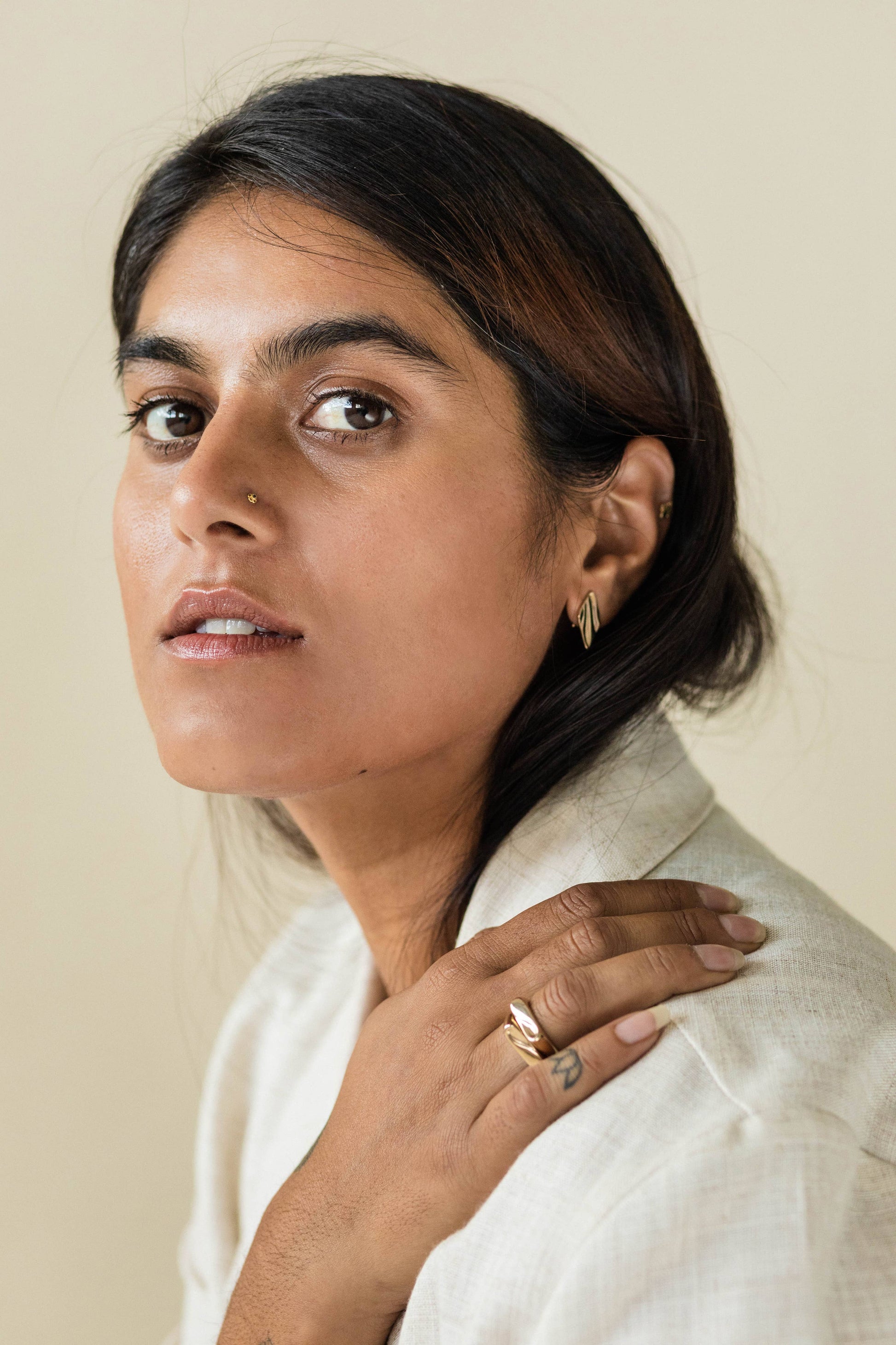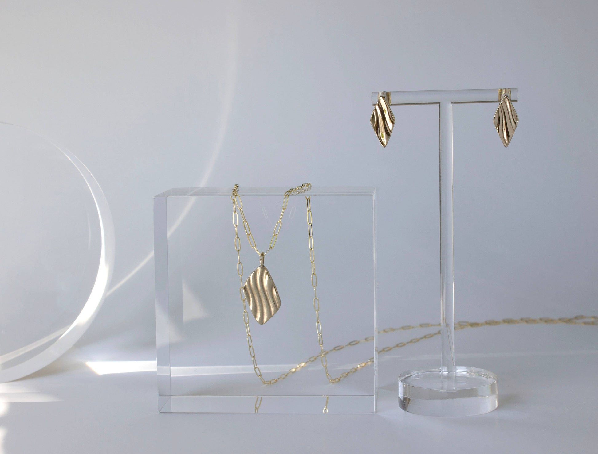 *Purchase is for one pair of earrings only* Sway stud earrings, from our fall 2022 line, s w a y: A line based on movement and flow, bending to not break, yielding only to remain balanced and intact. Pendants are originally hand-carved from wax and then cast via lost wax method. Sculpted by referencing the curl and waves in wood grain. Earring pendants available in yellow bronze or sterling silver with 14K gold fill or 925 sterling silver push backs. Posts are surgical steel. Earring pendants measures approximately .50" W x .75" L.