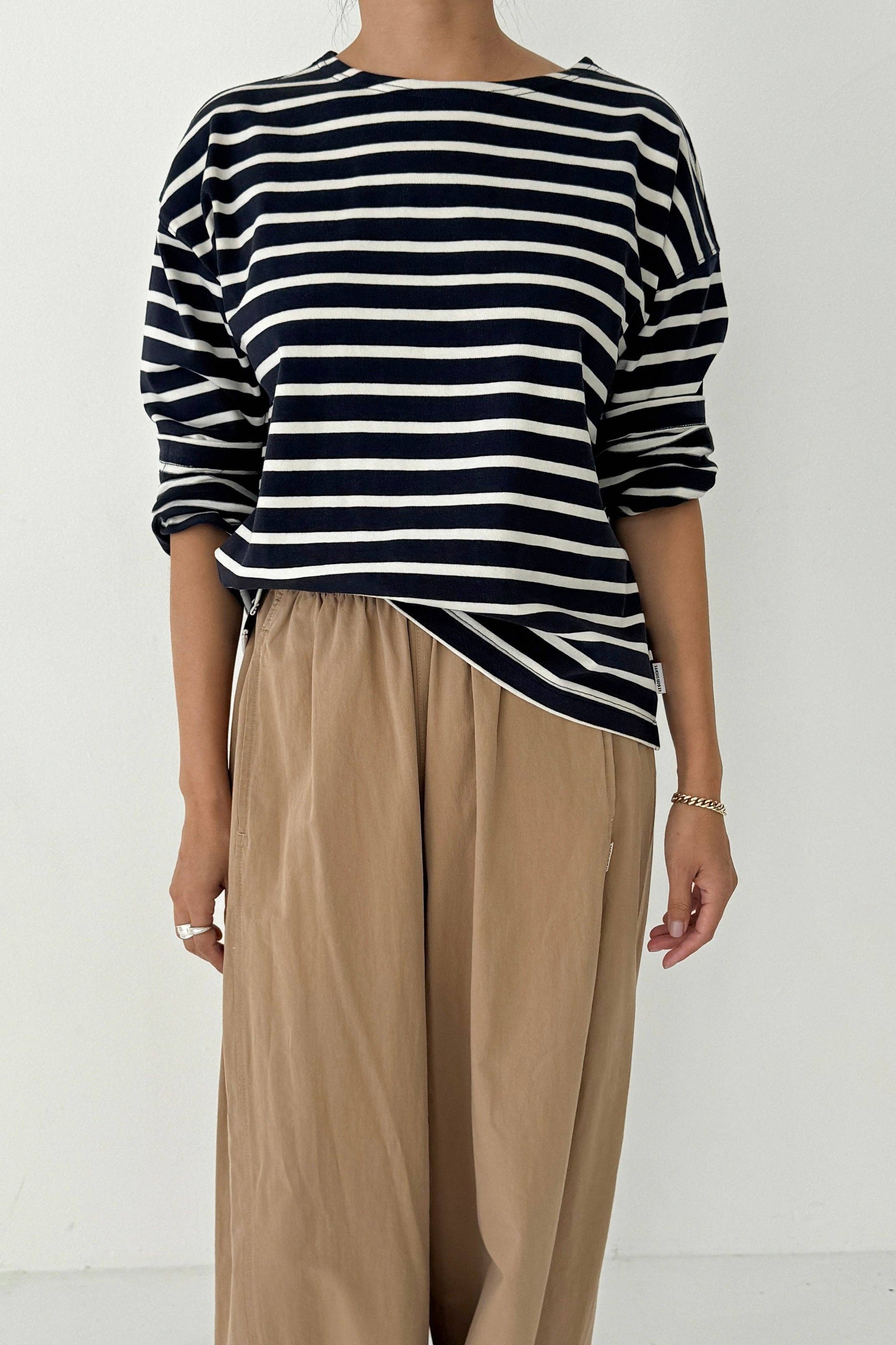 A nautical long sleeve with a classic fit. The Sailor Top takes design cues from the Marseille Top, featuring a Breton stripe and boxy shape, but updated with a flattering round neckline and a slightly cropped length that pairs effortlessly with high-waisted bottoms.