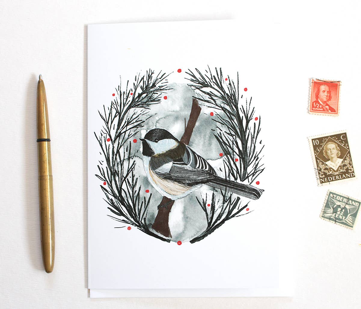 Hello! This is a listing for a blank holiday card featuring a little chickadee.