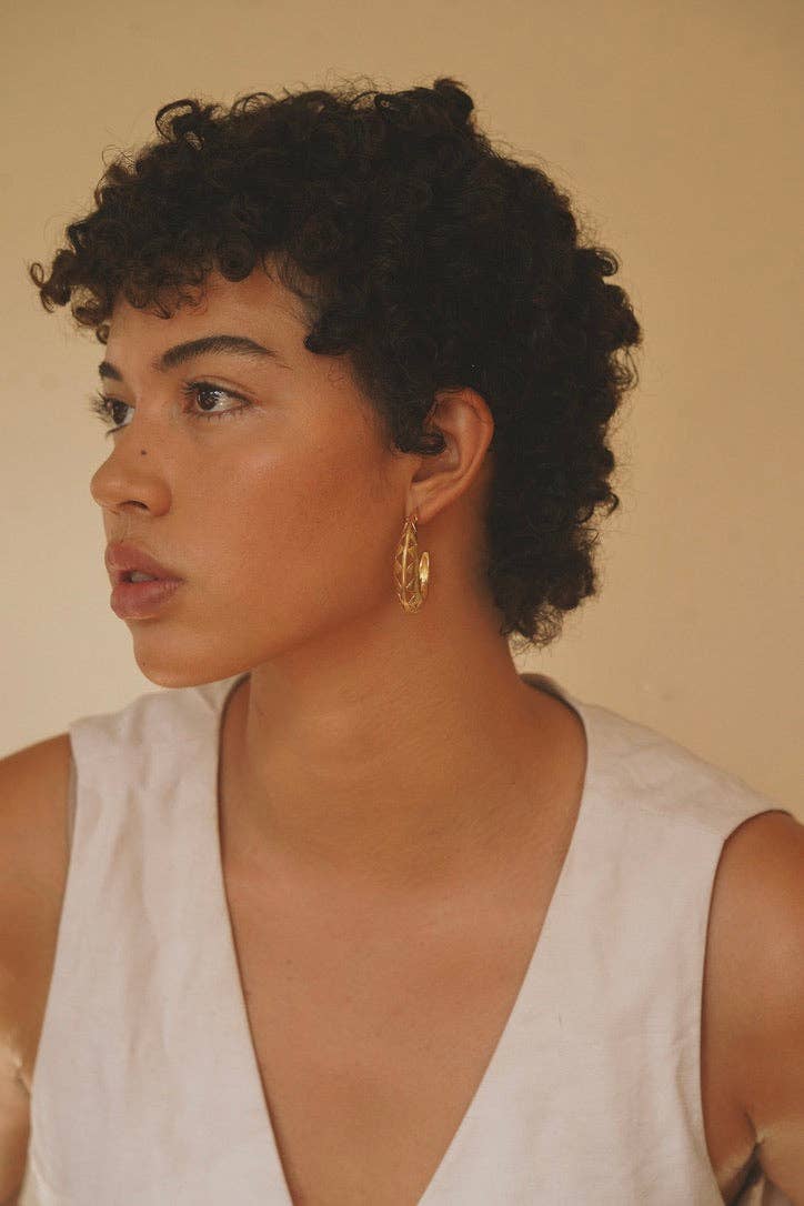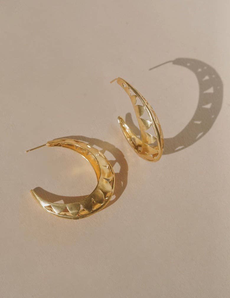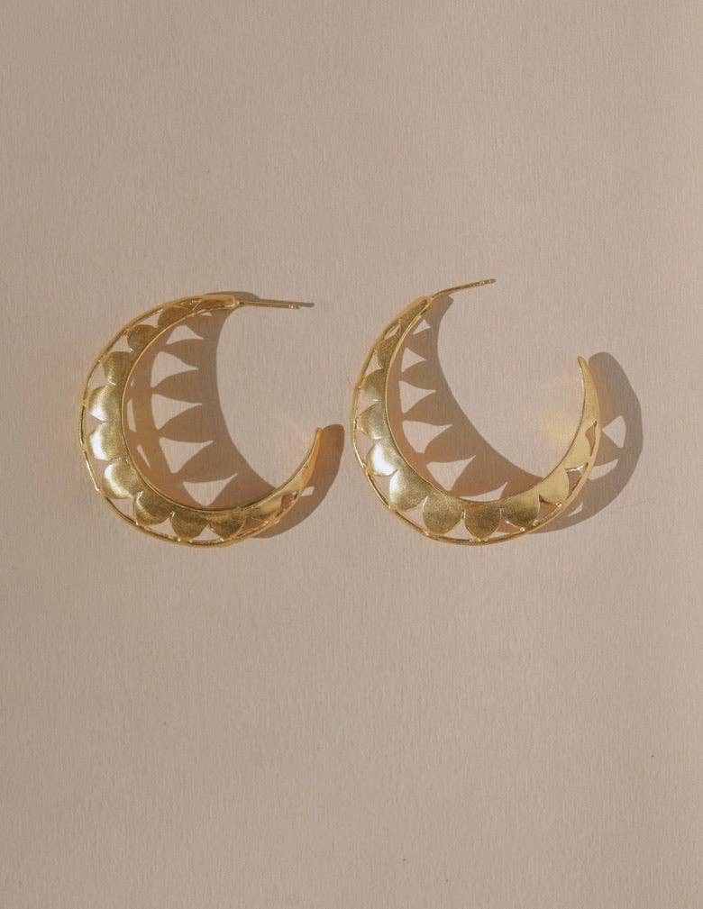 These sculptural petal hoop earrings in gold vermeil are a forever favorite — a true labor of love. Hand-carved with intricate detail, they blend Southwest-inspired artistry with a geometric, cutout design that feels both organic and modern. Lightweight yet bold at 48 mm, these hoops stand out with their bright polished finish while remaining comfortable enough for all-day wear.
