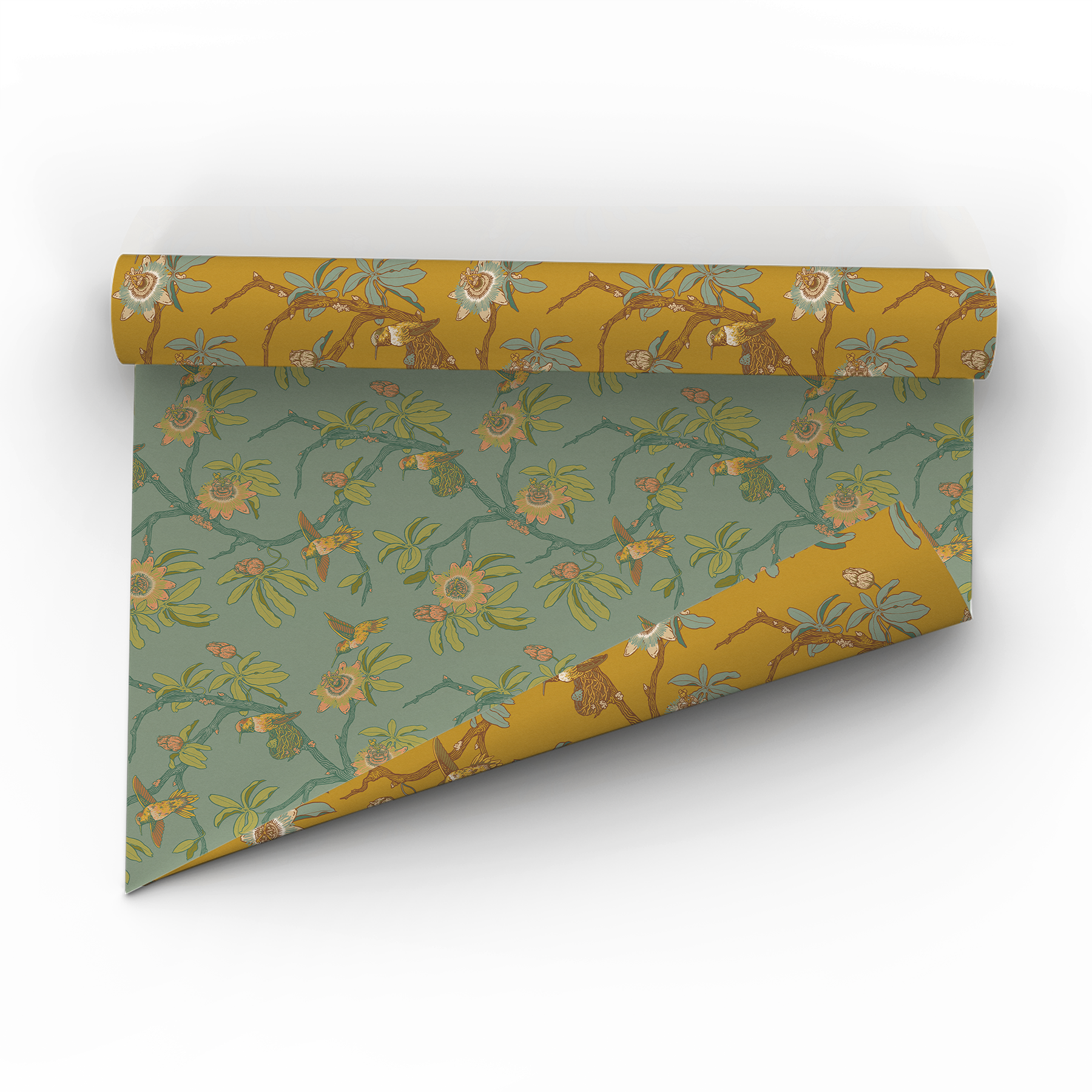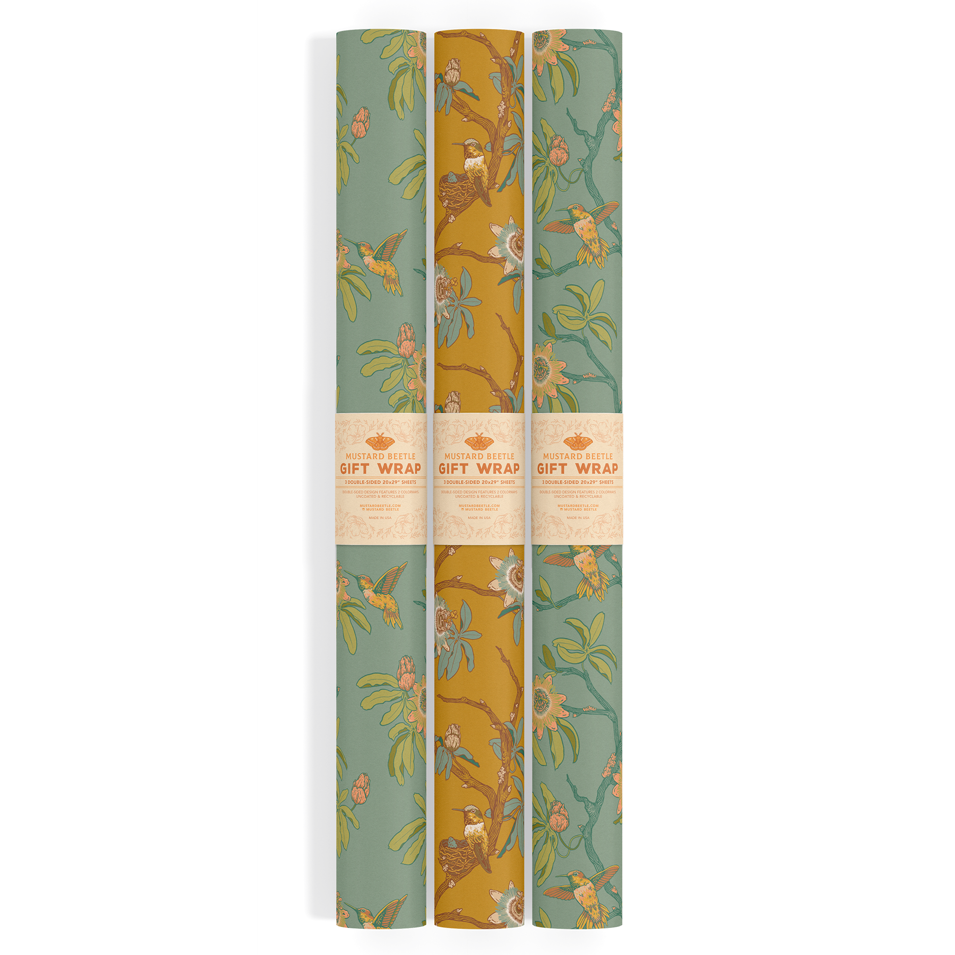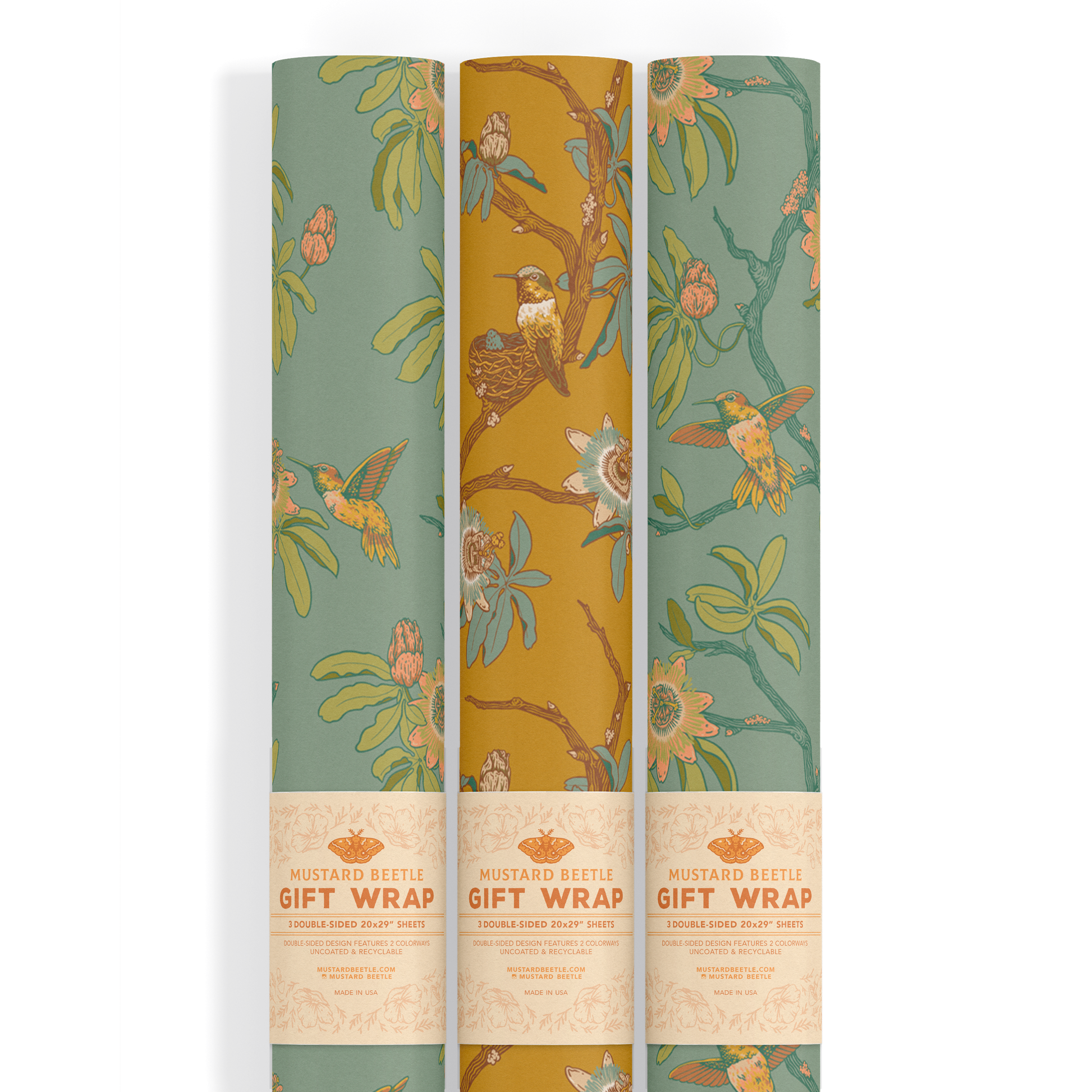 This item is a limited edition Set of 3 Gift Wrap Sheets featuring an Original Illustration "Hummingbirds & Passionflowers.” Includes 3 double-sided sheets ✸ Each Sheet measures 20x29” ✸ Each side features a different colorway of the same design ✸ Uncoated & Recyclable ✸ Made in California ✸ Rolled in a plastic sleeve with a belly band label