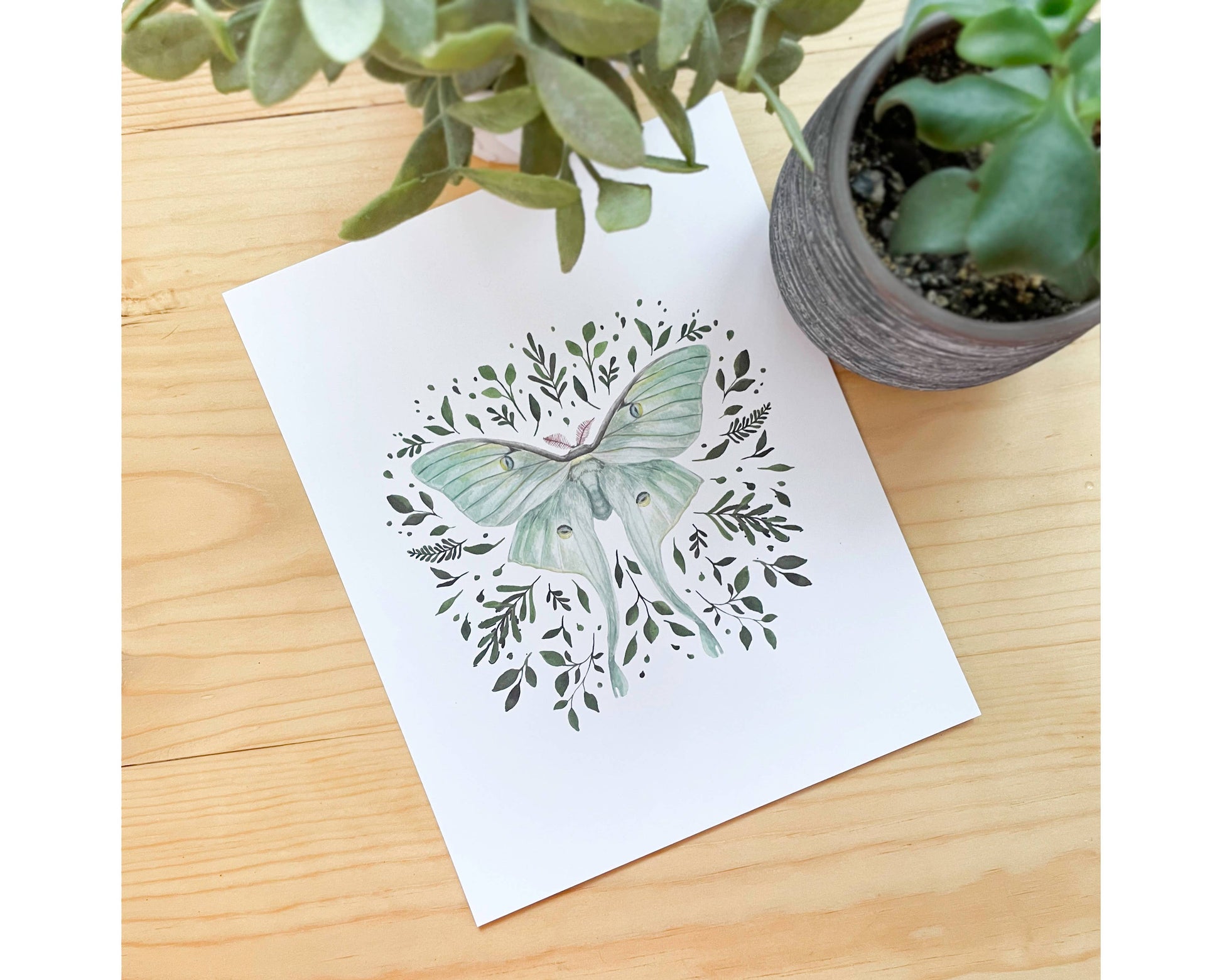 This vibrant Luna Moth art print is a reproduction of an original watercolor by a Michigan-based artist. Painted with professional Winsor & Newton watercolors, each print is produced in-house on thick Neenah cardstock using Canon inkjet printers for rich color and detail.
