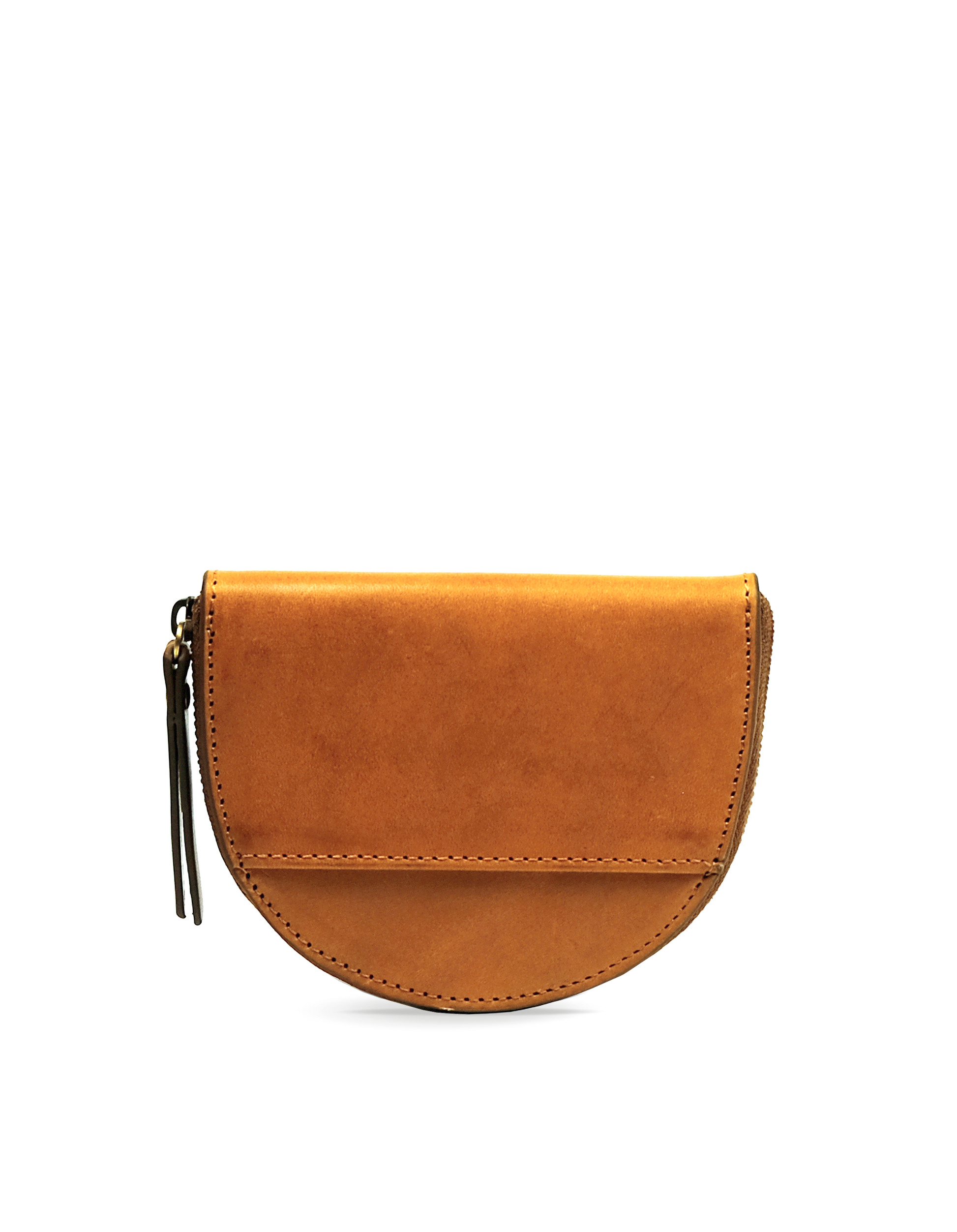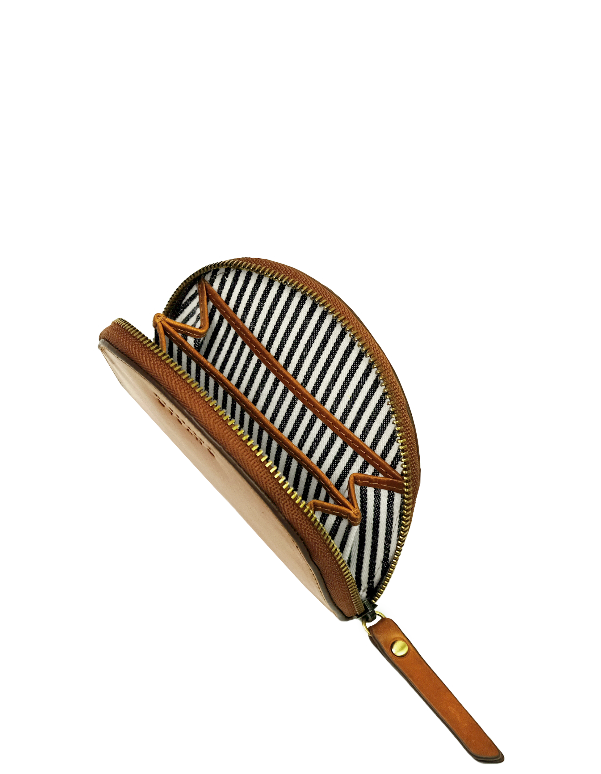Her compact semi-circle half-moon design holds enough space for cards - she opens to reveal two note compartments and two slots for cards but her top zipper fastening holds your coins as well. Just the right size and shape for all your daily needs.