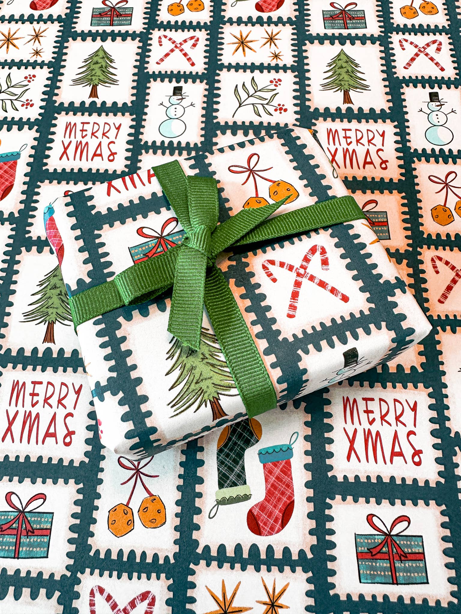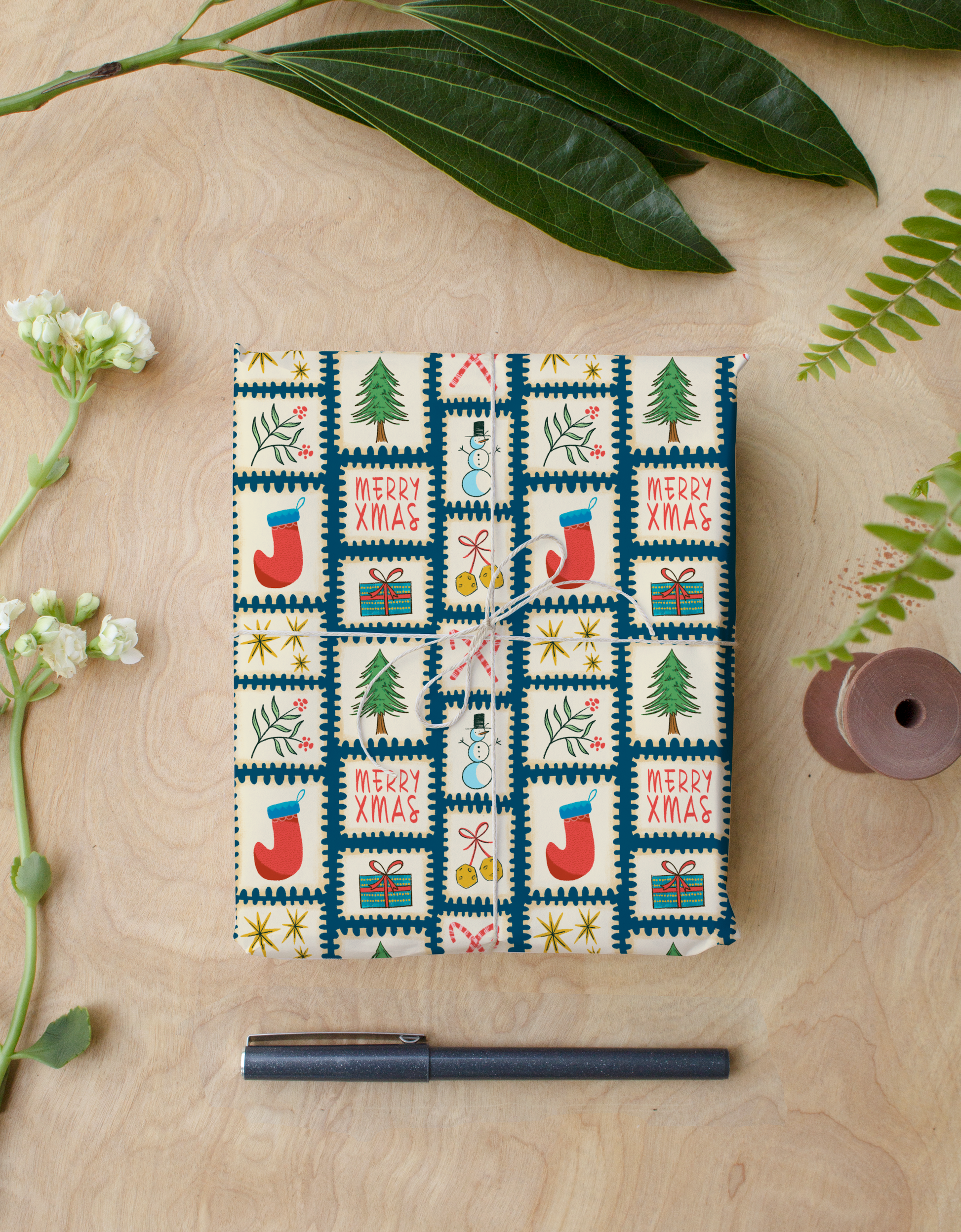 Make your shelves pop with our Dear Santa wrapping paper. Hand-drawn Christmas-stamp illustrations featuring ornaments, stockings, and evergreen trees come together in a holiday wrapping paper that captures the magic of the season. Cheerful and colorful, it’s a design customers love reaching for year after year.