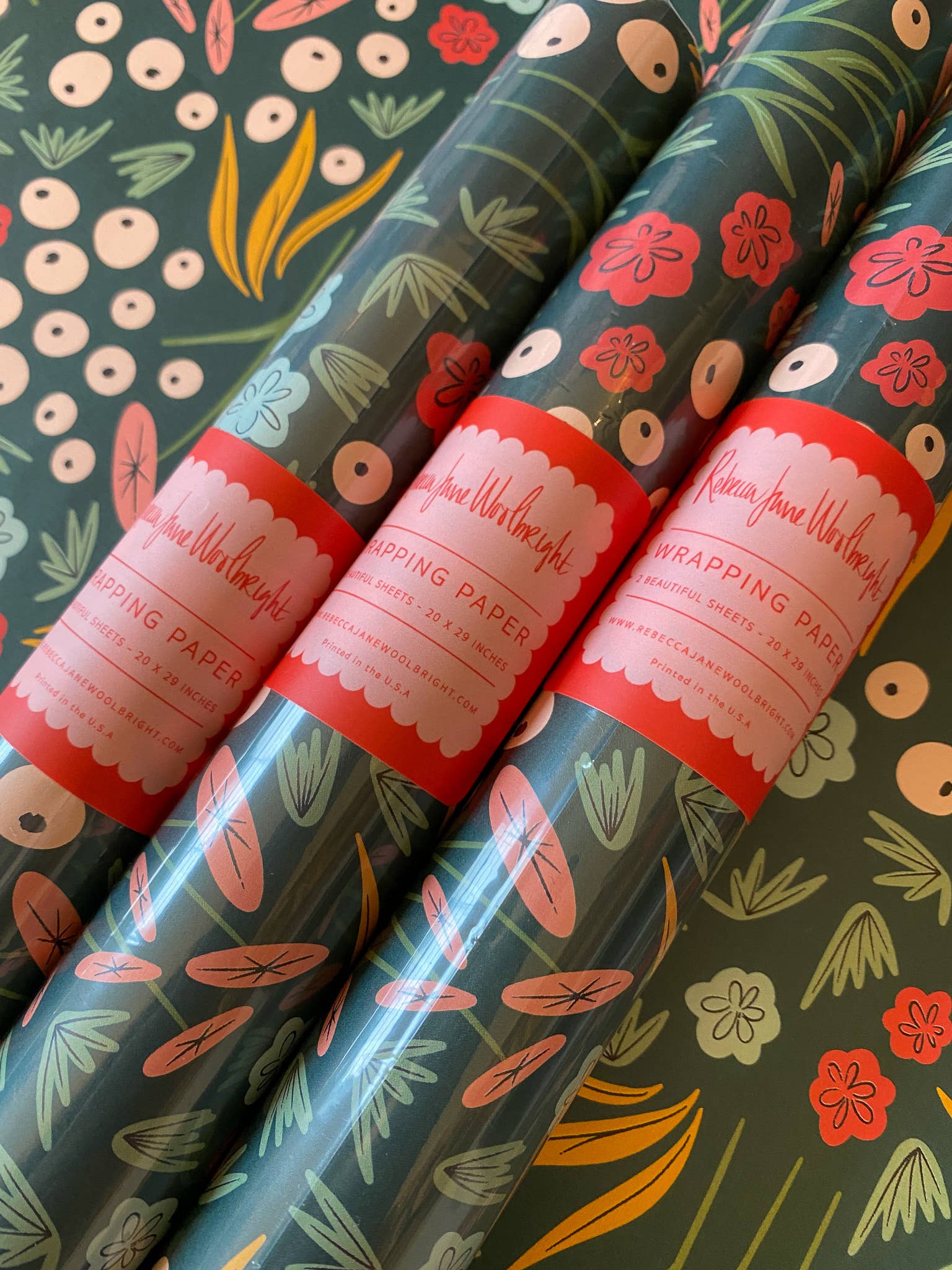 Bring an artful touch to your gift display with our Pirouette wrapping paper. Hand-drawn flowers in bright shades of red, pink, and blue bloom across a deep teal background, creating a botanical wrapping paper that feels joyful, modern, and full of energy. Perfect for both holiday and year-round gifting.