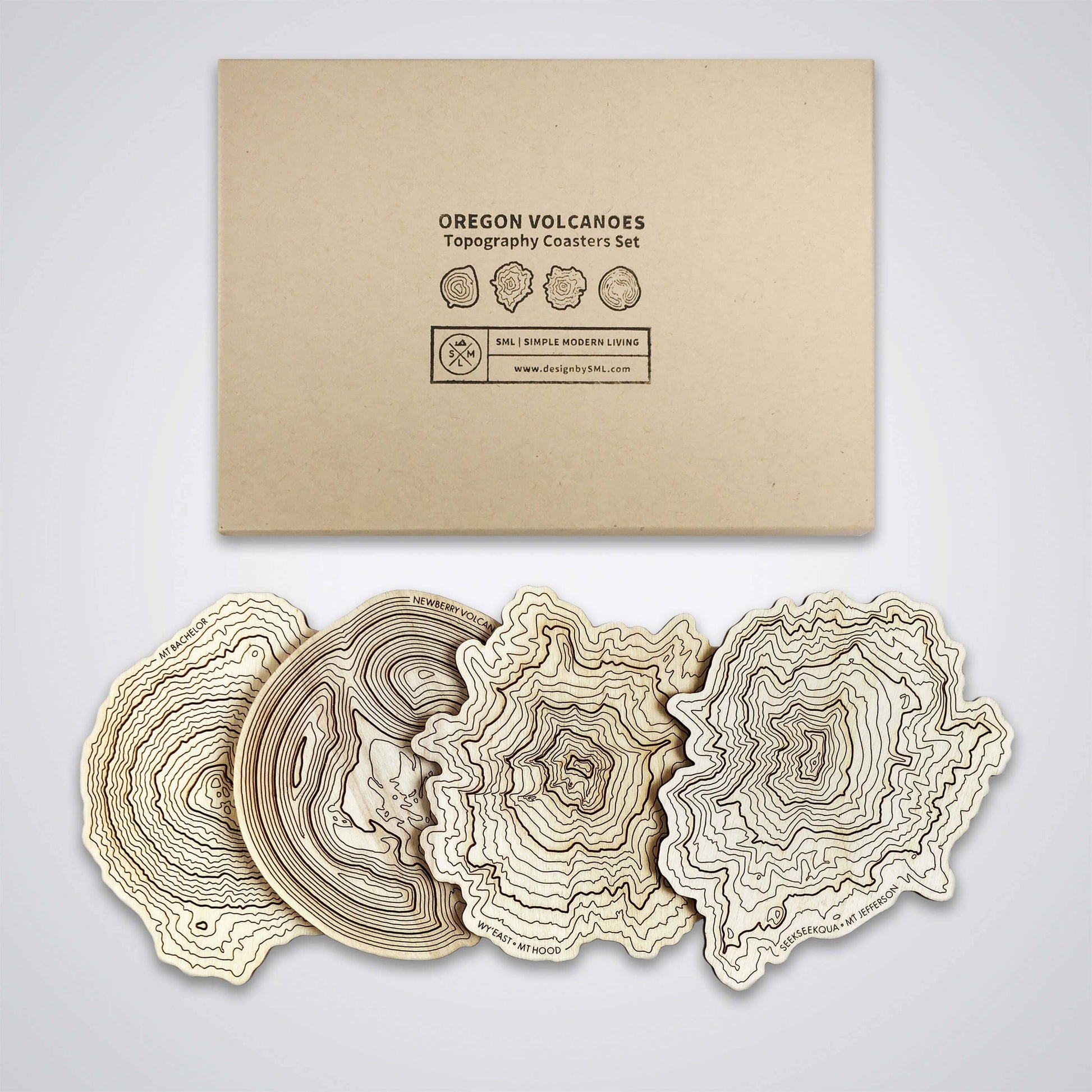 These wooden coasters features laser engraved topographic maps of Mt Hood, Mt Bachelor, Mt Jefferson, and Newberry Volcano.