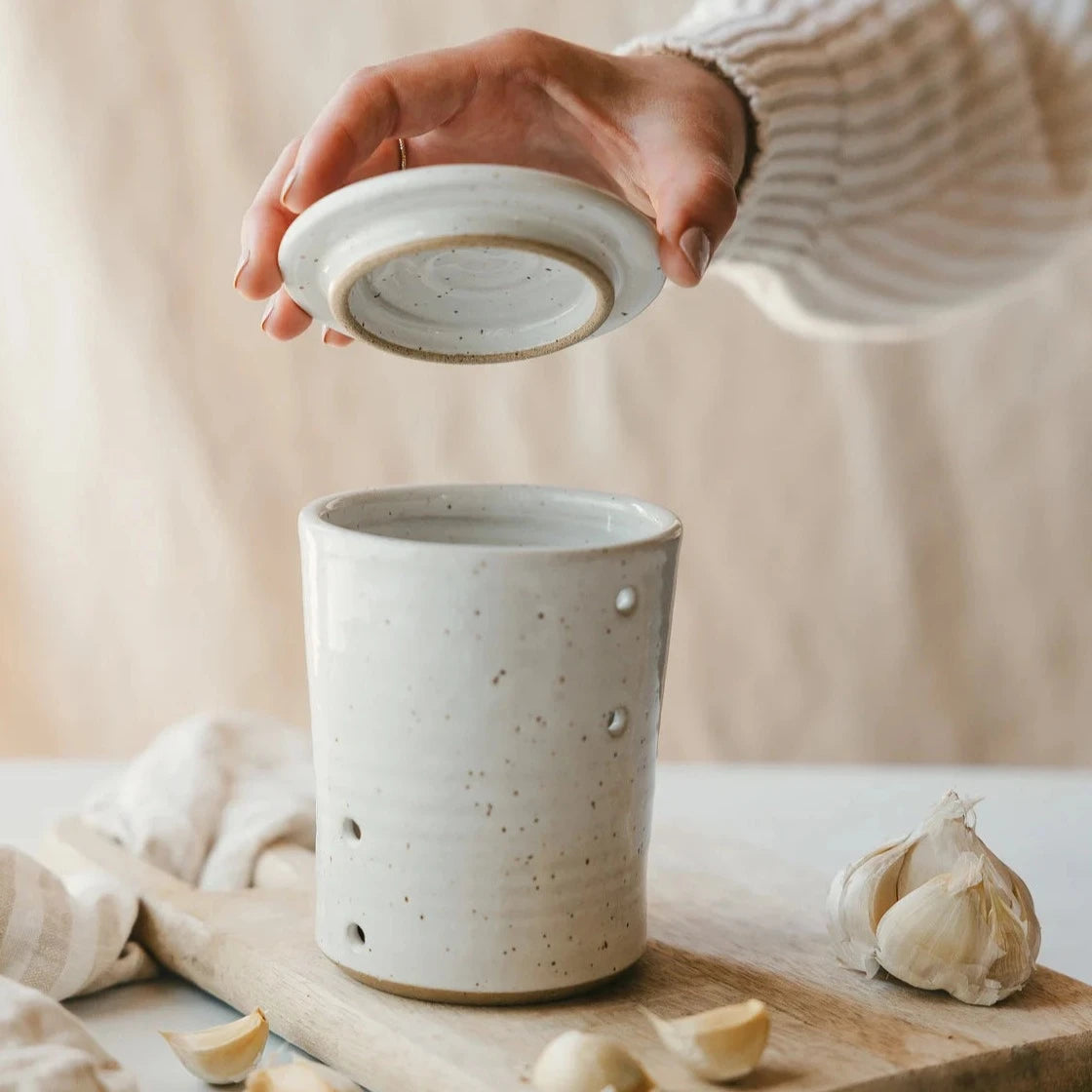 This beautiful garlic keeper is expertly crafted using a wheel-throwing technique, making it ideal for keeping your garlic and shallots fresh. Handcrafted in Graham, Washington, this jar is functional and a delightful addition to your kitchen!