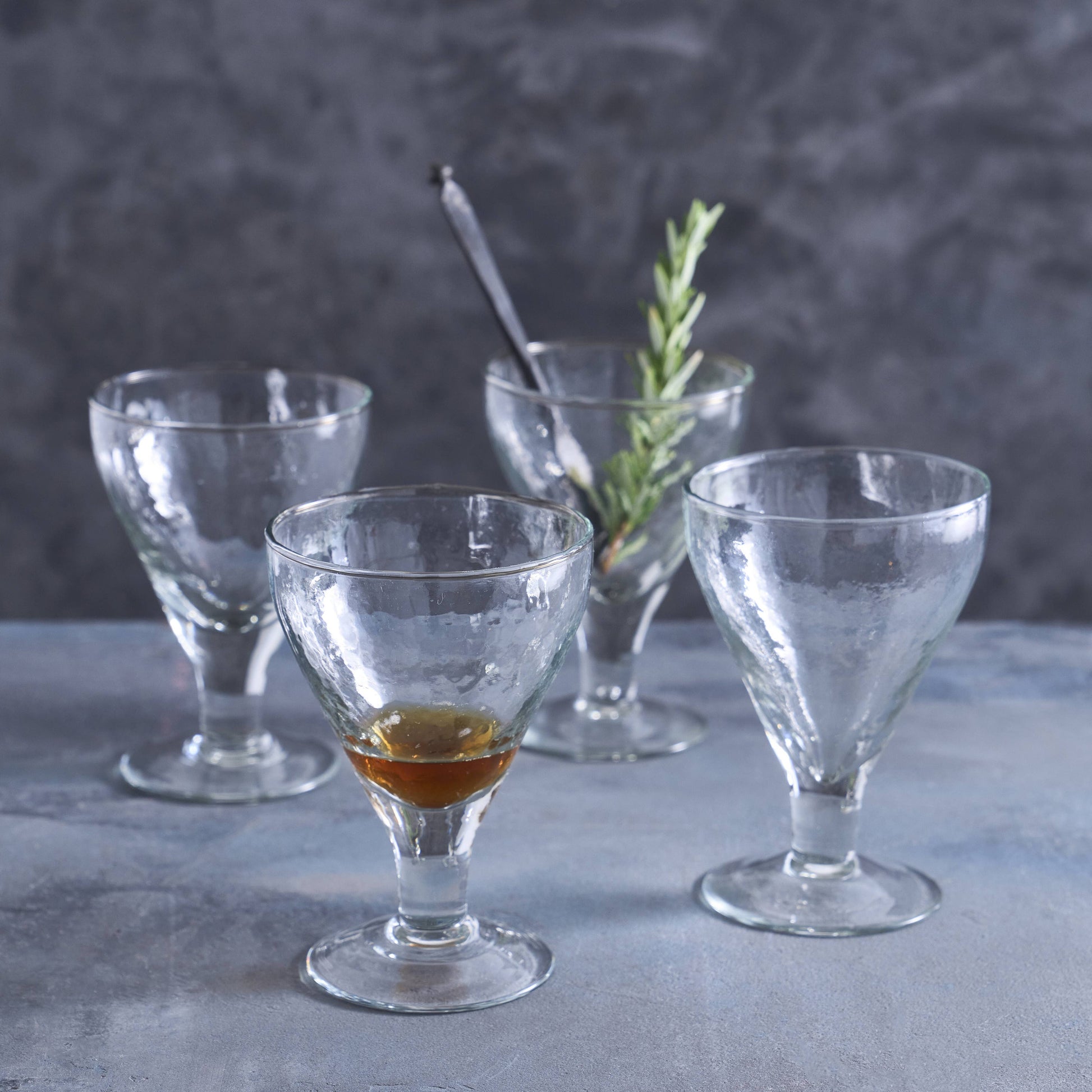 Crafted from partially recycled glass, each goblet features a subtle hammered texture and a soft green tint that gives it a timeless, old-world look unlike traditional stemware.
