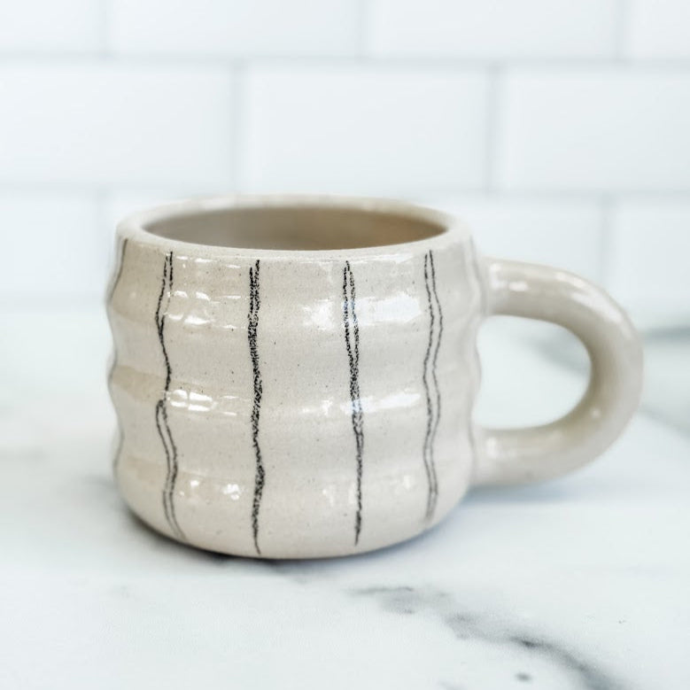 This 12 oz stoneware mug brings movement and charm to your daily ritual. Finished in a creamy speckled glaze with hand-drawn black lines that ripple across the surface, no two are exactly alike. Its subtly wavy form fits comfortably in your hand while adding a playful, artful touch. Handmade in Portland, Oregon.